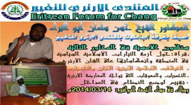 يستضيف المنتدى الارتري للتغيير  عبر  غرفة البالتوك الدكتور الشيخ/حسن سلمان ابو البراء فى  امسية سياسيه فكرية ساخنة يتناول  فيها التطورات السياسيه التى تشهدها المنطقة ، وازمة التيارات الاسلاميه السياسيه فى المنطقة وانعكاساتها على الشأن الارترى وايضا سيقف على تحديات وافاق  الحركات الاسلاميه السياسيه الارتريه والتحديات والعقبات التى تواجه المعارضة الارتريه ككل وايضا سيقوم  بتقييم  وضع  النظام فى داخل الوطن ..