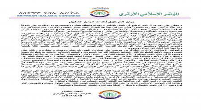 والمؤتمر الإسلامي الإرتري انطلاقا من حرصه على استرداد اليمن شرعيته ووحدته واستقراره ، فإنه يعلن تأييده ودعمه الأكيد للخطوات التي اتخذتها المملكة العربية السعودية والحلف الاسلامي بإعتبارها خطوات مهمة ومسؤولة في كبح التمدد الصفوي الذي يهدف للنيل من  السلم الأهلي  والتعايش المذهبي وزعزعة أمن المنطقة واستقرارها ، ودعم ومساندة الشرعية في اليمن حتى تنهض بمسؤولياتها تجاه شعبها ،  وكما تبعث الكثير من الأمل والثقة في بناء واقع إسلامي جديد في المنطقة قادر عَلى التصدي لكافة التحديات التي تواجه المنطقة ، وفي هذا الإطار يناشد المؤتمر الإسلامي الإرتري الدول الإسلامية والعربية شعوبا وحكومات والمجتمع الدولي على تحمل مسؤولياتهم في هذا الظرف الدقيق ، بمنع إيران من استغلال الظروف التي تمر بها المنطقة في توسيع أطماعها التي تدفع المنطقة بشدة إلى حافة حرب طائفية ، وكذلك الضغط على جماعة الحوثي للامتثال للشرعية التي تراضى عليها الشعب اليمني ، وحملهم على الجلوس إلى طاولة الحوار باعتباره خيار لا بديل له سوى الانزلاق إلى الفوضى والحرب .